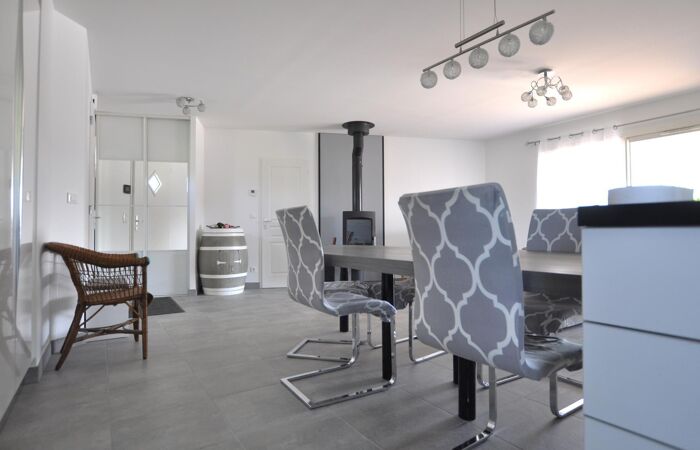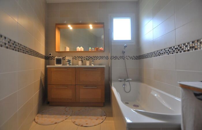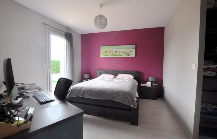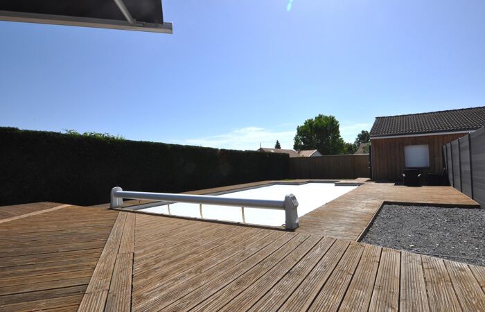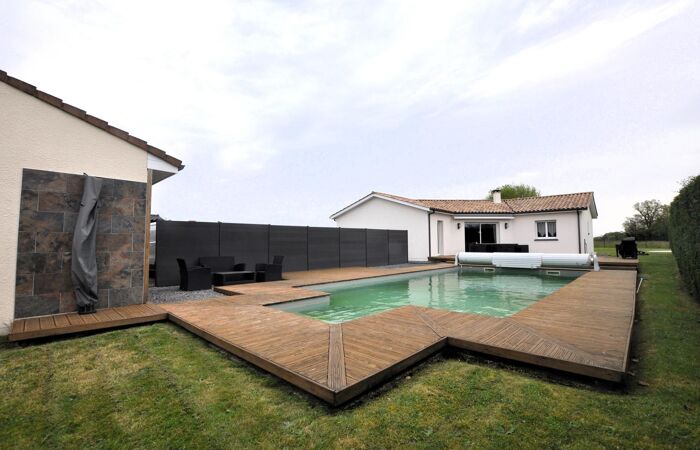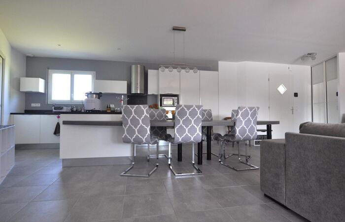Maison contemporaine 2012 en parfait état comprenant 1 cuisine aménagée et équipée ouverte sur séjour, 1 cellier, 1 suite parentale (chambre, dressing, salle d'eau avec WC), 1 couloir, 2 chambres, 1 salle de bains,1 WC ; terrasse bois, piscine sans vis-à-vis, garage double, 4 places de parking ; terrain autour.