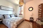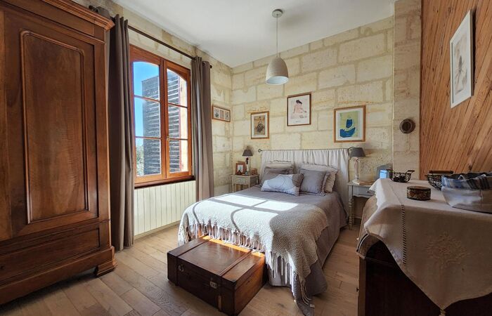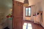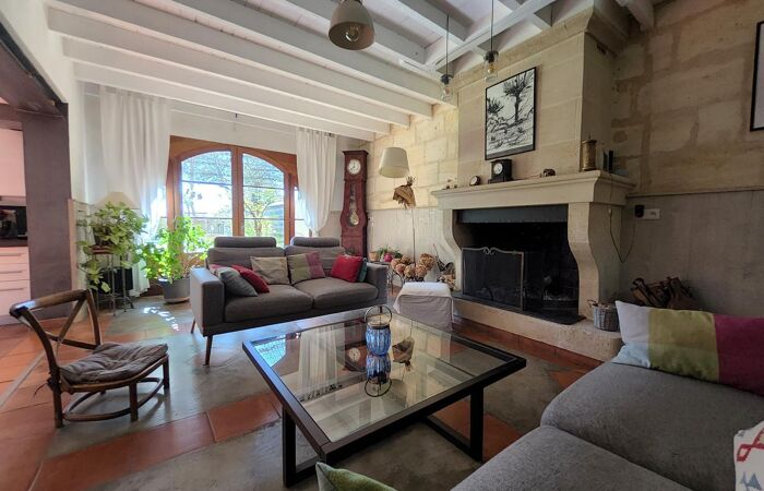 Maison de bourg de charme, exposée SUD-OUEST, la maison bénéficie de jolies fins d'après-midi sur la terrasse qui prolonge la cuisine aménagée et équipée ouverte sur un salon tourné vers sa cheminée en pierre.