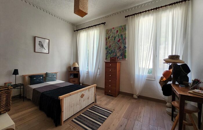 Elle bénéfice de 4 chambres, dégagements, paliers, dressing, 1 salle d'eau, 1 salle de bains, 2 WC et bureau ; le tout agrémenté de nombreuses annexes très pratiques : buanderie, chaufferie, serre, 3 abris, garage et carport ; piscine au fond du terrain paysagé.
