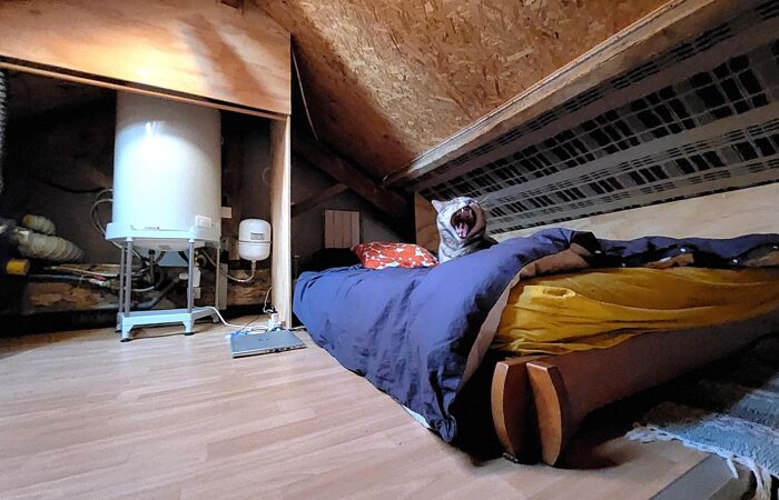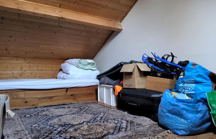Chambre aménagée dans les combles accès échelle.