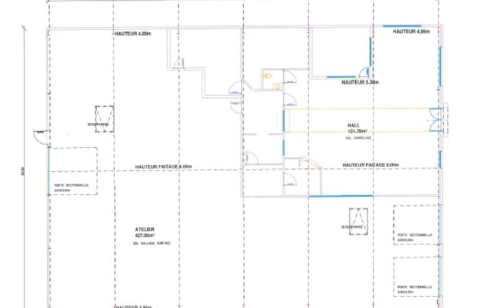 Construction de 20 ans d'une surface de 660 m² composée d'1 hall de 121.70 m², 1 atelier 427 m² avec une hauteur au faîtage de 6 m, sanitaire public, sanitaire privé, bureaux.