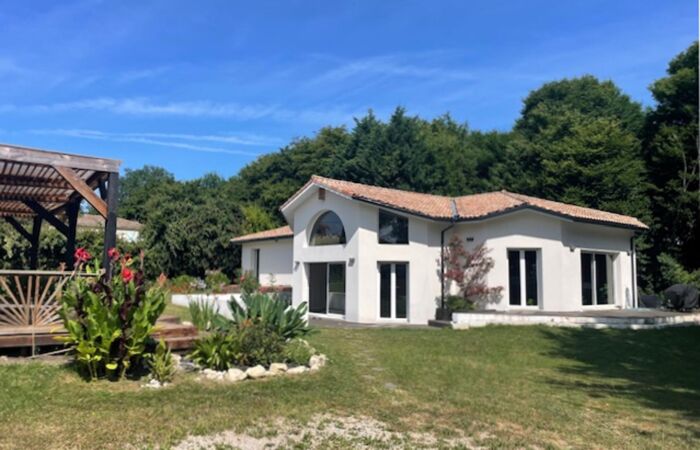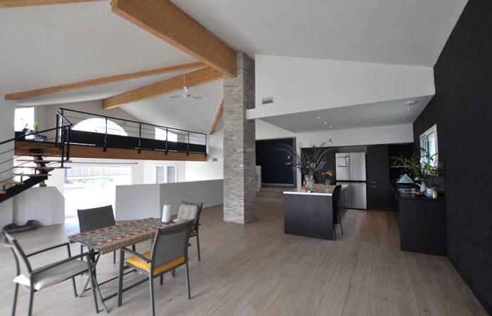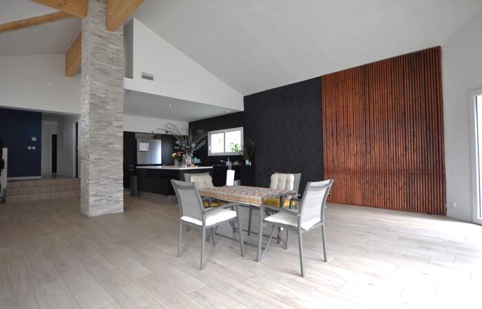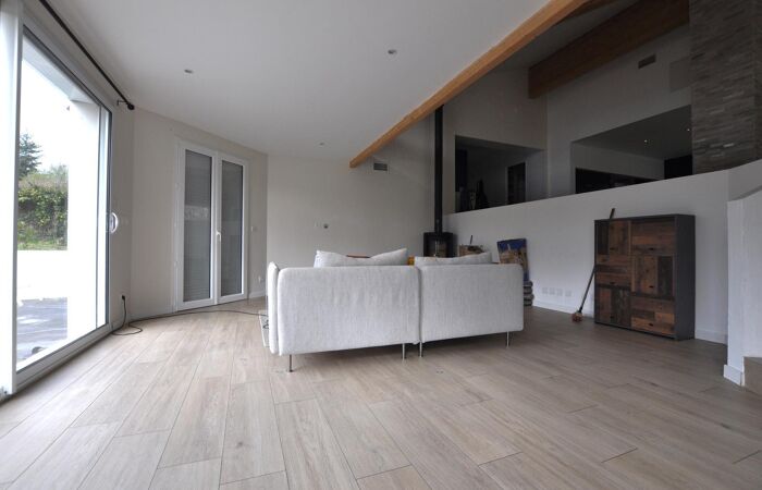 Dans un environnement calme, cette construction contemporaine séduit par ses beaux volumes habitables et sa luminosité. Composée d'1 entrée, 1 vaste pièce à vivre : cuisine aménagée et séjour de 68 m², 1 salon de 38 m² avec poêle à bois, ainsi qu'1 mezzanine de 22 m² idéale pour un espace bureau ou détente, 1 cellier, 1 couloir, 3 chambres dont 1 suite parentale avec salle d'eau et dressing, 1 WC, 1 grande salle de bains ; terrasse attenante et non attenante couverte bois ; le tout sur un terrain clos de 1 306 m².