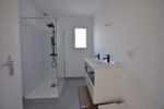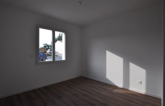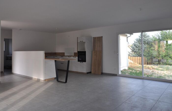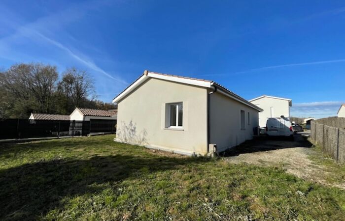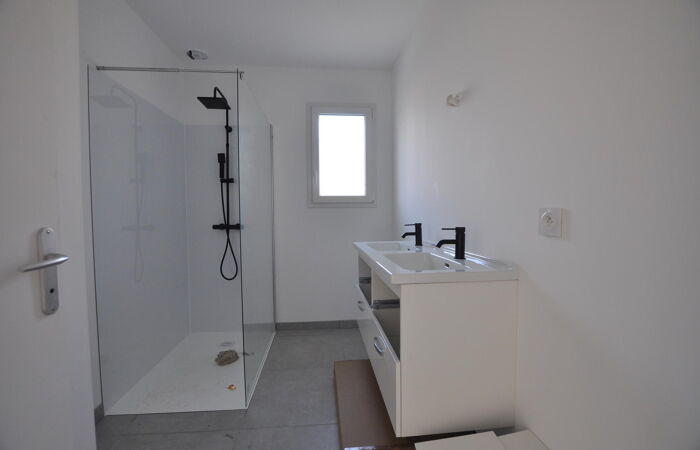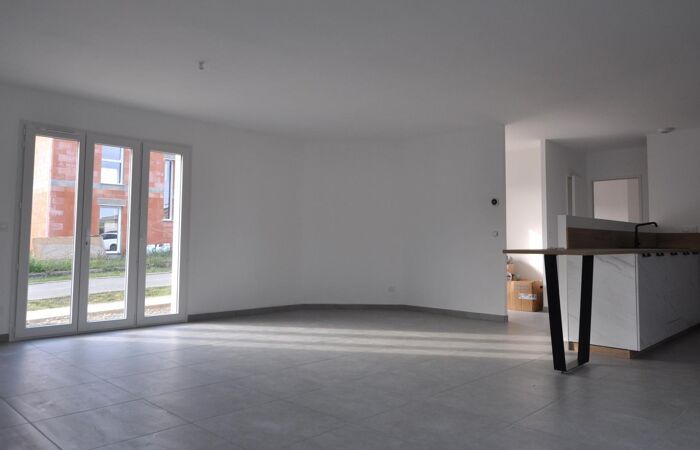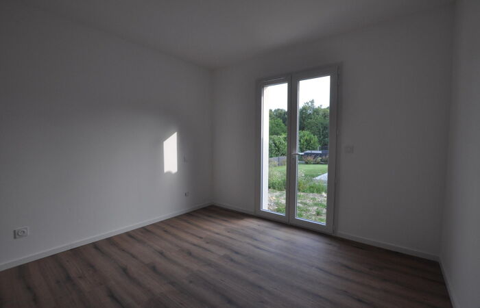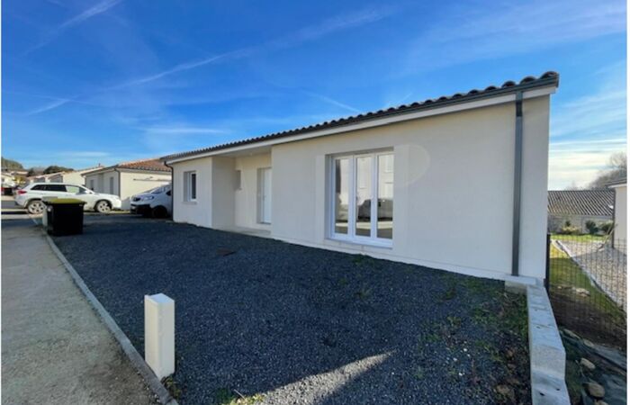 Maison neuve de plain-pied comprenant 1 entrée / salon / superbe cuisine aménagée et équipée, 1 WC, 1 couloir, 4 chambres, 1 salle d'eau, 1 cellier ; jardin autour avec muret de soubassement, la pelouse sera plantée le mois prochain.