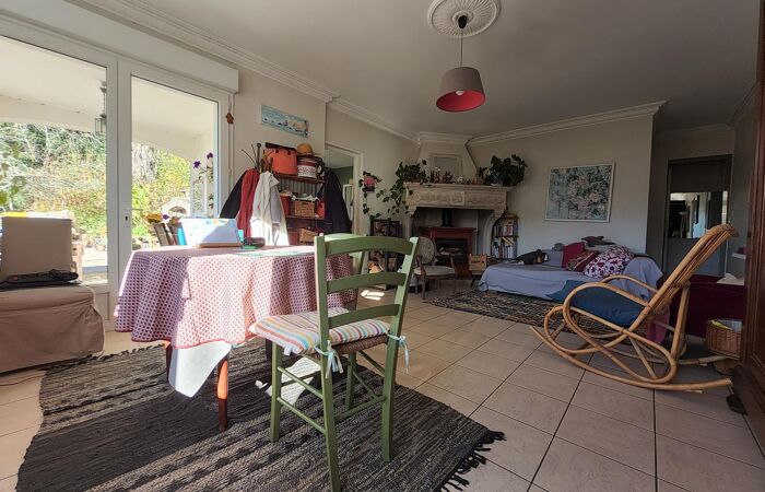 Maison des années 60 assurant une construction traditionnelle et de qualité. Elle offre des espaces de vie tournés vers la nature et lumineux, séjour avec poêle de masse, cuisine séparée, 3 chambres et bureau.