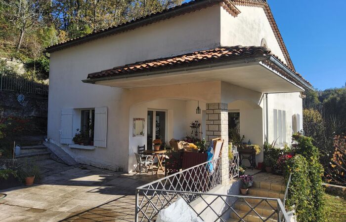 A l'extérieur, une vaste terrasse pour partie couverte, garage et superbe terrain paysagé de plus de 4 000 m² en position dominante avec vue dégagée, source et étang.