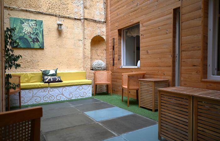Bel appartement offrant un salon lumineux avec belles hauteurs sous plafond, 1 cuisine aménagée et équipée, 1 salle d'eau, des WC séparés, 1 chambre, ainsi qu'1 chambre avec cabinet de toilette indépendante donnant de l'autre côté de la cour privative close et couverte de 17 m².