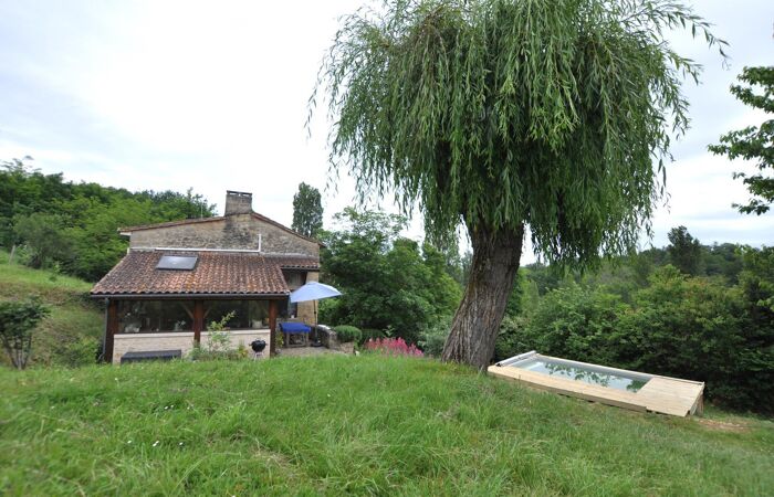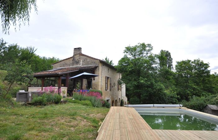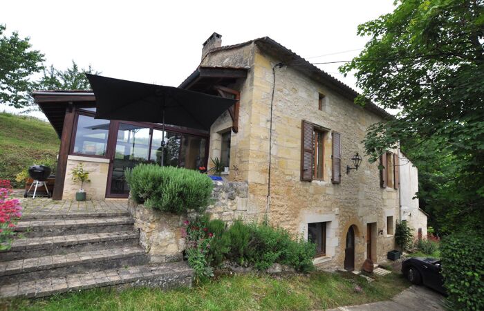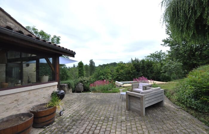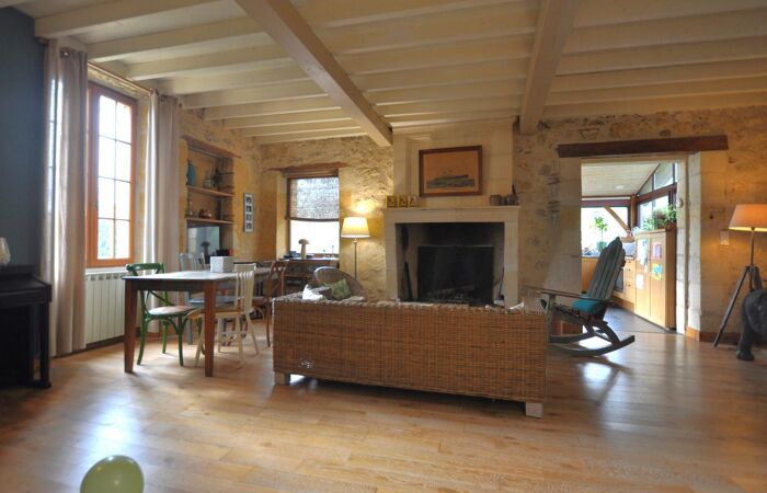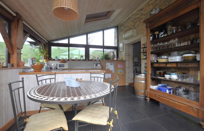 Bâtisse en pierre élevée en rez-de-chaussée d'1 entrée, 1 chaufferie, 1 gîte (cuisine aménagée ouverte sur pièce,1 salle de d'eau avec WC, 1 cave à vin) ; en rez-de-jardin 1 cuisine aménagée et équipée, 1 salon avec cheminée, 1 bureau, 1 dégagement, 1 WC, 1 chambre et 1 salle de bains ; à l'étage 1 palier, 3 chambres, 1 salle d'eau (espace enfants) ; 1 dépendance, 1 terrasse et piscine ; le tout implanté dans un environnement privilégié (voie sans issue, vue dégagée) sur une parcelle de plus de 6 500 m².