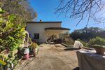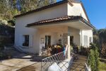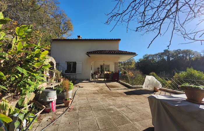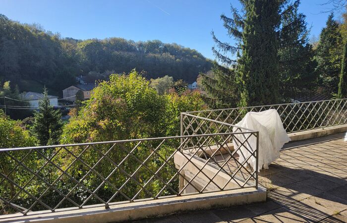 A l'extérieur, une vaste terrasse pour partie couverte, garage et superbe terrain paysagé de plus de 4 000 m² en position dominante avec vue dégagée, source et étang.