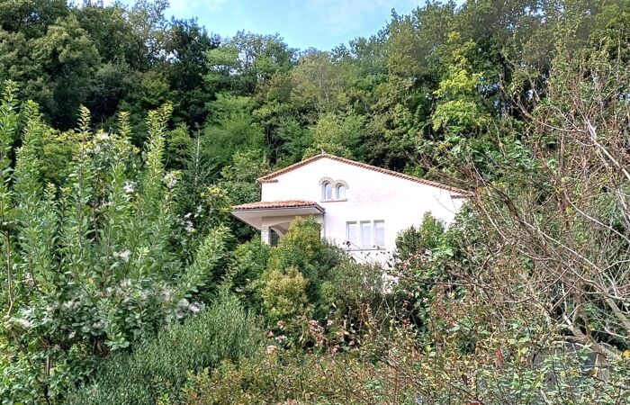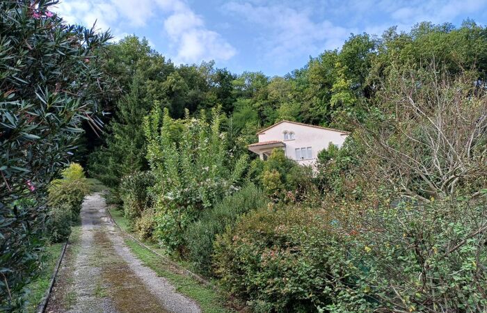 A l'extérieur, une vaste terrasse pour partie couverte, garage et superbe terrain paysagé de plus de 4 000 m² en position dominante avec vue dégagée, source et étang.