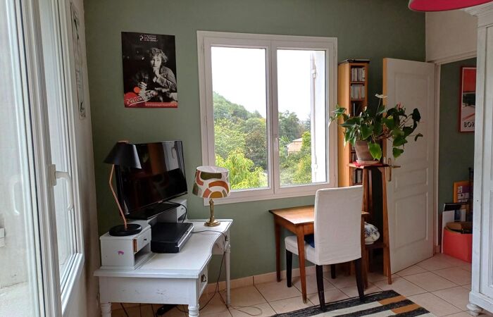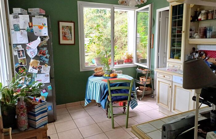 Maison des années 60 assurant une construction traditionnelle et de qualité. Elle offre des espaces de vie tournés vers la nature et lumineux, séjour avec poêle de masse, cuisine séparée, 3 chambres et bureau.