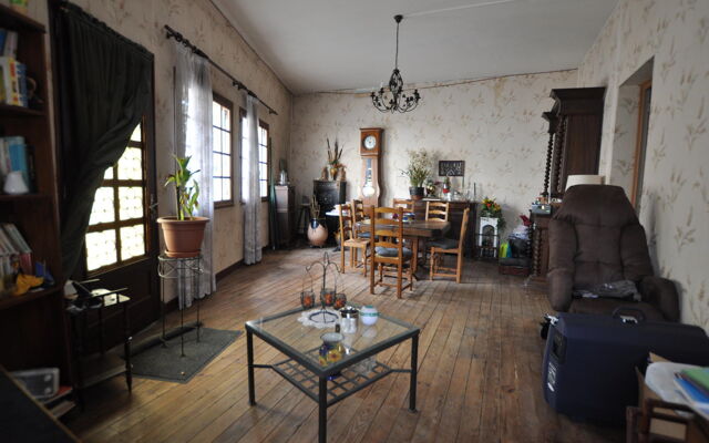 Maison de bourg en pierre élevée sur cave comprenant 1 cuisine, dégagement, 1 salon, 1 WC; à l'étage : palier desservant 3 chambres, 1 salle de bain avec WC.